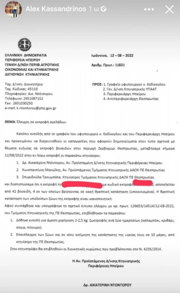 Σύμφωνα με το πόρισμα της διεύθυνσης κτηνιατρικής υπηρεσίας της Περιφέρειας Ηπείρου και όπως ανέφερε με ανάρτησή του ο κ. Κασσανδρινός, στη συγκεκριμένη κτηνοτροφική μονάδα εκτροφής, διαπιστώθηκε ότι 4 αγελάδες από τα 42 βοοειδή ήταν υποσιτισμένες, ενώ οι υπόλοιπες σε ικανοποιητική κατάσταση. Σύμφωνα με το πόρισμα της κτηνιατρικής υπηρεσίας δόθηκε εντολή για άμεση χορήγηση 2 με 2,5 κιλών ζωοτροφής ανά ζώο ημερησίως, ενώ θα διεξαχθεί επανέλεγχος των ζώων σε 10 ημέρες για εκ νέου εκτίμηση της κατάστασης της υγείας τους.
