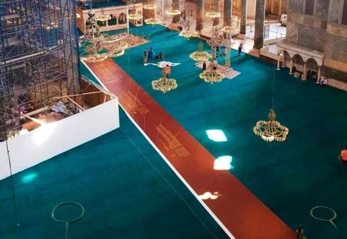 «86 χρόνια περιμέναμε αυτή την ημέρα» είπε ο πρόεδρος Ερντογάν όταν εκείνη την Παρασκευή, της πρώτης μουσουλμανικής προσευχής, ο ίδιος, ο επικεφαλής της Διεύθυνσης Θρησκευτικών Υποθέσεων, Αλί Ερμπάς, και μια μεγάλη συνοδεία αξιωματούχων και πολιτικών προσευχήθηκαν για πρώτη φορά γονατισμένοι στο κατακαίνουργιο παχύ τουρκουάζ χαλί. Το χαλί, από ντόπιο μαλλί, είχε σκεπάσει το βυζαντινό μαρμάρινο πάτωμα, περίφημο για τους κυματισμούς του που έδινε την εντύπωση ότι πατούσες σε μια «μαρμαρωμένη θάλασσα».
