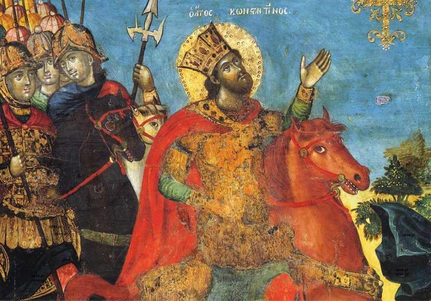 Ήθελε να προσευχηθεί, να ζητήσει βοήθεια, αλλά καθώς διηγείται ο ιστορικός Ευσέβιος, δεν ήξερε σε ποιόν Θεό να απευθυνθεί. Τότε έφερε νοερά στη σκέψη του όλους αυτούς που μαζί τους συνδιοικούσε την αυτοκρατορία. Όλοι τους, εκτός από τον πατέρα του, πίστευαν σε πολλούς θεούς και όλοι τους είχαν τραγικό τέλος. Άρχισε, λοιπόν, να προσεύχεται στον Θεό, υψώνοντας το δεξί του χέρι και ικετεύοντάς Τον να του αποκαλυφθεί. Ενώ προσευχόταν, διαγράφεται στον ουρανό μία πρωτόγνωρη θεοσημία. Περί τις μεσημβρινές ώρες του ηλίου, κατά το δειλινό δηλαδή, είδε στον ουρανό το τρόπαιο του Σταυρού, που έγραφε «τούτῳ νίκα». Και ενώ προσπαθούσε να κατανοήσει τη σημασία αυτού του μυστηριακού θεάματος, τον κατέλαβε η νύχτα. Τότε εμφανίζεται ο Κύριος στον ύπνο του μαζί με το σύμβολο του Σταυρού και τον προέτρεψε να κατασκευάσει απομίμηση αυτού και να το χρησιμοποιεί ως φυλακτήριο πιο πολέμους.