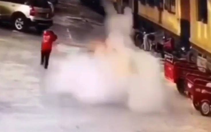 Βίντεο έχει καταγράψει τη στιγμή που το φρεάτιο εκρήγνυται στο πρόσωπο του μικρού αγοριού και τον στέλνει να ίπταται προς στιγμή στον αέρα.