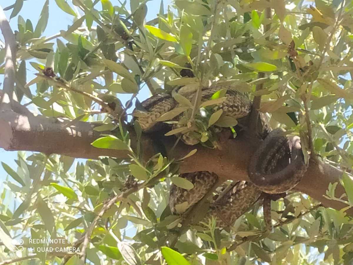 Το περιστατικό συνέβη στην περιοχή τον Φιλιατρών, στην Μεσσηνία. Τα ερπετά ήταν τυλιγμένα μαζί στο ελαιόδεντρο και δεν έφευγαν παρά τη φασαρία.