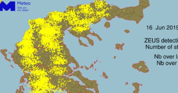 Ο συνδυασμός των θερμών και υγρών επιφανειακών αέριων μαζών με την ισχυρή αστάθεια πάνω από τη χώρα μας, δηλαδή την απότομη πτώση της θερμοκρασίας με το ύψος, οδήγησαν σε μεγάλο αριθμό καταιγίδων χθες. Λίγο μετά το μεσημέρι της Κυριακής οι πρώτες αναπτύξεις καταιγίδων παρατηρήθηκαν στην Πίνδο και στα ορεινά της Ανατολικής Μακεδονίας, ενώ γρήγορα επεκτάθηκαν στο μεγαλύτερο μέρος της ηπειρωτικής χώρας.