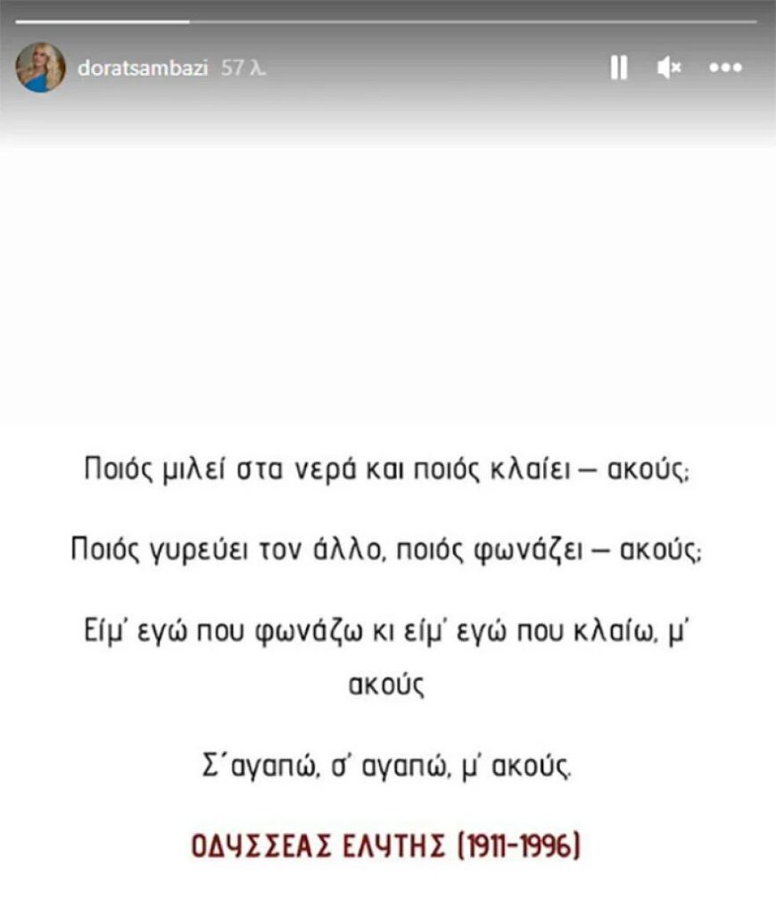 Με το «Μονόγραμμα» του Ελύτη τον αποχαιρέτησε η σύζυγός του και δημοσιογράφος, Δώρα Τσαμπάζη, η οποία έδινε τον δικό της αγώνα στο πλάι του αυτό το διάστημα.