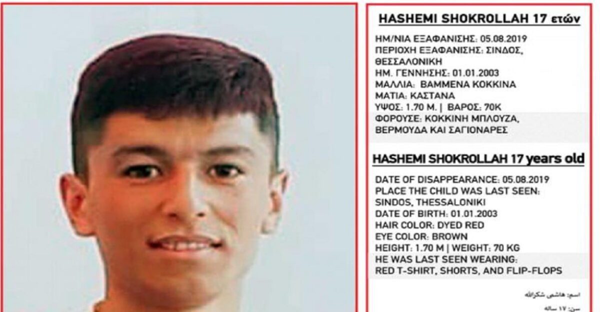 Στις 05/08/2019 και ώρα 12:30 εξαφανίστηκε από την Σίνδο Θεσσαλονίκης, ο Hashemi(ον) Shokrollah (επ) 17 ετών αφγανικής καταγωγής.