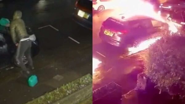 Αστυνομικοί και πυροσβέστες κλήθηκαν στο περιστατικό στις 10 το βράδυ εν μέσω των φόβων ενός κατοίκου ότι το σπίτι του θα καταστρεφόταν μετά την πυρπόληση του αυτοκινήτου του. Τα πλάνα δείχνουν έναν κουκουλοφόρο να πετάει τα καύσιμα από ένα δοχείο πριν ανάψει ένα σπίρτο και απομακρυνθεί τρέχοντας από τα φλεγόμενα αυτοκίνητα.
