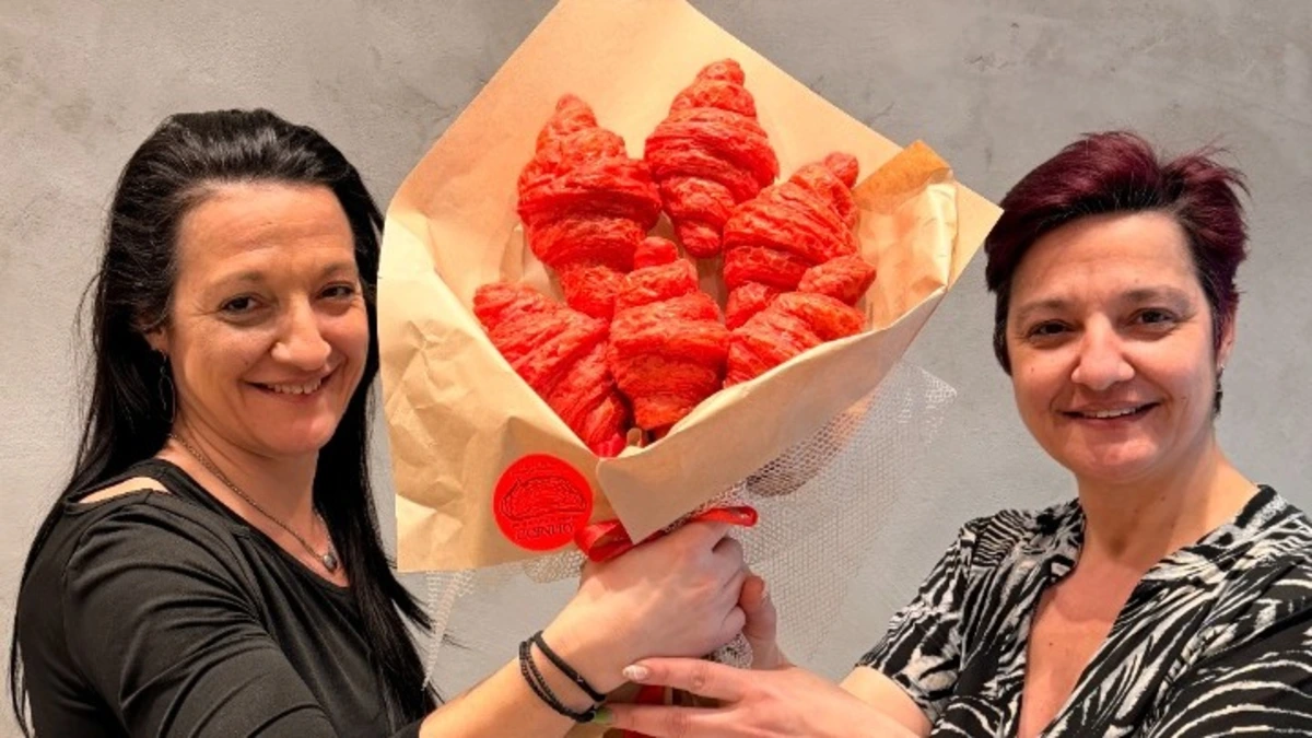 Δεν διατηρούν ανθοπωλείο αλλά φούρνο –και στις δικές τους ανθοδέσμες δεν πρωταγωνιστεί το τριαντάφυλλο, αλλά κατακόκκινα κρουασάν σε ένα βρώσιμο μπουκέτο. Για τους λάτρεις της συγκεκριμένης ζύμης, αυτή η «ανθοδέσμη» μυρίζει βούτυρο, δεν μπαίνει σε βάζο αλλά σε πιάτο ή στο χέρι — και κατευθείαν στο… στομάχι.