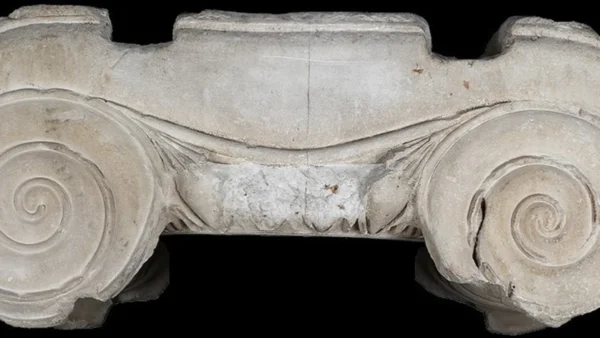 Με μήκος 1,71 μ. και πλάτος 0,83 μ., το κιονόκρανο προέρχεται προφανώς από δημόσιο οικοδόμημα και χρονολογείται στα 500-480 π.Χ.. Οι χαρακτηριστικές έλικες, κοίλες προς την εξωτερική πλευρά και κυρτές προς την εσωτερική, τα ανθέμια στο κέντρο, τα λογχόσχημα φύλλα και το κυματίο με ανάγλυφα ωά, μαρτυρούν την αρμονία και την ακρίβεια της αρχαϊκής ιωνικής τέχνης. Οι πλάγιες όψεις του διακοσμούνται με βαθιές, κάθετες αυλακώσεις, ενώ το λευκό μάρμαρο της Θάσου υποδεικνύει προέλευση από θασιακό καλλιτεχνικό εργαστήριο.