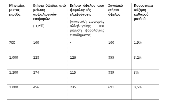 Το όφελος για μισθωτούς με απολαβές 1.000 ευρώ από μείωση ασφαλιστικών εισφορών και φορολογία διαμορφώνεται σε 355 ευρώ τον χρόνο, για μισθό 1.200 ευρώ το όφελος κλιμακώνεται σε 389 ευρώ και για μισθό 2.000 ευρώ το όφελος είναι 691 ευρώ.
