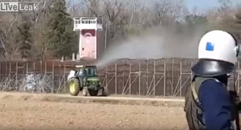 Στο βίντεο φαίνεται τρακτέρ εφοδιασμένο με ψεκαστικό μηχάνημα να κινείται παράλληλα προς τον φράκτη στον Έβρο και να ψεκάζει τους πρόσφυγες και μετανάστες που βρίσκονται στην άλλη πλευρά των συνόρων.