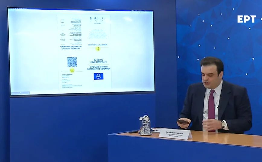 Ο κ. Πιερρακάκης χρησιμοποίησε το κινητό του τηλέφωνο για να δείξει ακριβώς τη μορφή του ψηφιακού πράσινου πιστοποιητικού. Χρησιμοποίησε την ελληνική εφαρμογή που θα χρησιμοποιηθεί από ελληνικούς φορείς για να διακριβώνει εάν το έγγραφο είναι αυθεντικό, μέσω ειδικού QR κωδικού.