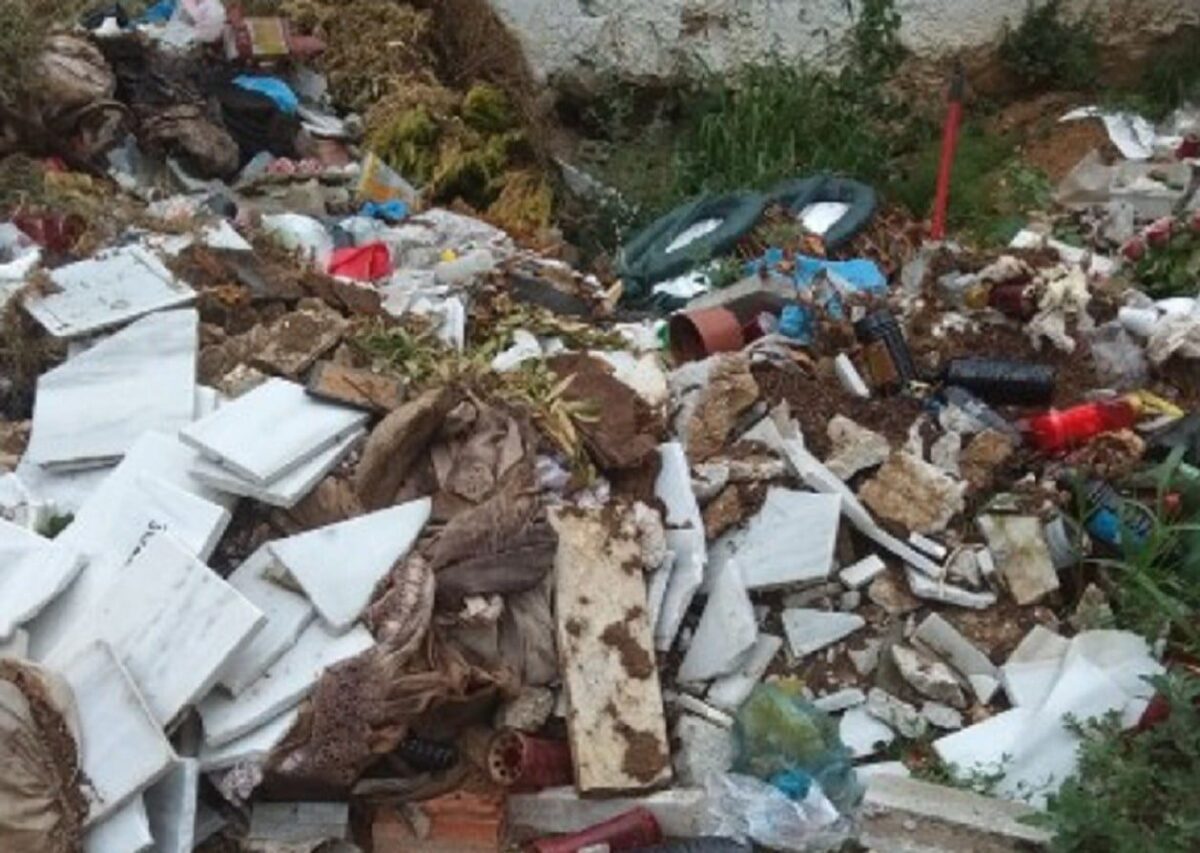 Μια αυτοσχέδια χωματερή έχει στηθεί έξω από τα κοιμητήρια του Αγίου Γεωργίου στην Νιγρίτα Σερρών. Κάθε λογής σπουπιδαριό από μπάζα, σπασμένα μάρμαρα από τάφους, καντήλια, πλαστικά μπουκάλια πεταμένα έξω από την είσοδο των κοιμητηρίων δημιουργούν εστία μόλυνσης