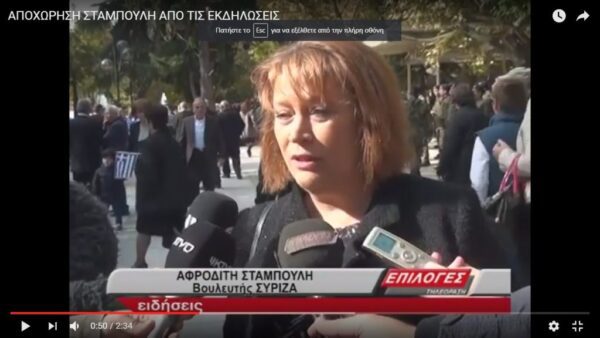 Για άλλη μια φορά η βουλευτής Σερρών του Συριζα Αφροδίτη Σταμπουλή, διαμαρτυρόμενη για την αυθαίρετη κατάθεση στεφάνου από εκπρόσωπο της Χρυσής αυγής, αποχώρησε από τη συνέχεια των εκδηλώσεων, περιφρονώντας την παρέλαση και την δεξίωση στο διοικητήριο ΡΕΠΟΡΤΑΖ ...