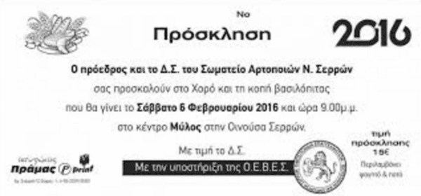 Το Σωματείο Αρτοποιών Ν. Σερρών διοργανώνει εκδήλωση κοπή Βασιλόπιτας και ετήσιο χορό το Σάββατο 6 Φεβρουαρίου 2016 και ώρα 21:00 στο ...