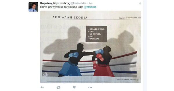Το χιούμορ που διαθέτει απέδειξε, για μια ακόμη φορά, ο Κυριάκος Μητσοτάκης, ο οποίος αφιέρωσε σήμερα, Πέμπτη (28/01/2016), μέσω Twitter, στον Αλέξη Τσίπρα ένα σκίτσο του Δημήτρη Χαντζόπουλου στην εφημερίδα «Καθημερινή». ...