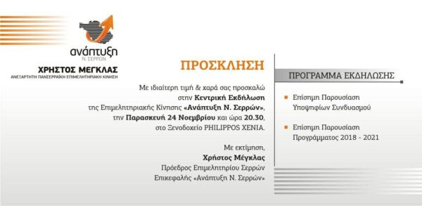 Ανοιχτή - Κεντρική Εκδήλωση για την επίσημη παρουσίαση των υποψηφίων και του προγράμματος 2018 - 2021, του Συνδυασμού "Ανάπτυξη Ν. Σερρών" ...