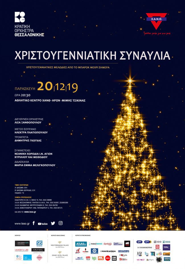 Φέτος, μαζί με την Κ.Ο.Θ., εμφανίζονται στη σκηνή η μέτζο σοπράνο Ηλέκτρα Πλατιοπούλου και ο τρομπετίστας Δημήτρης Γκόγκας, υπό τη μουσική διεύθυνση της Λίζας Ξανθοπούλου. Την καλλιτεχνική παρέα συμπληρώνει η νεανική χορωδία του Ιερού Ναού Κυρίλλου και Μεθοδίου. Η συναυλία, υπό τον τίτλο “ Χριστουγεννιάτικες μελωδίες από το μπαρόκ μέχρι σήμερα”, είναι διάρκειας 70-75 λεπτών. Τιμές εισιτηρίων: Α΄ Διάζωμα: 20 ευρώ, Β’ Διάζωμα (κερκίδα): 12 ευρώ, Παιδικό: 7 ευρώ.
