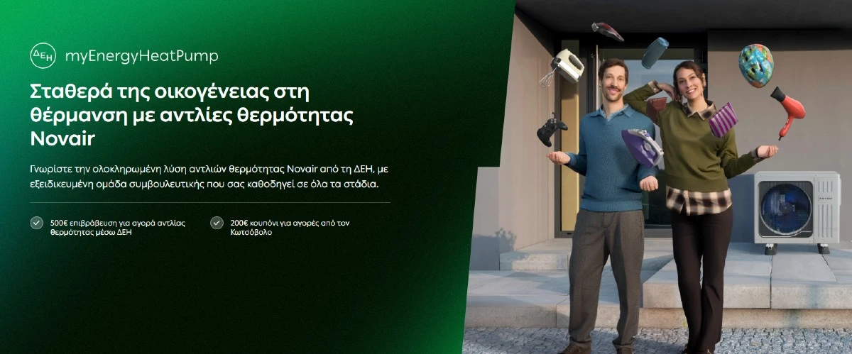 Η ΔΕΗ φέρνει ολοκληρωμένες λύσεις που συνδυάζουν υψηλή ενεργειακή απόδοση και σημαντική εξοικονόμηση κόστους, ενώ παράλληλα συμβάλλουν ουσιαστικά στην προστασία του περιβάλλοντος. Το ΔΕΗ myEnergy HeatPump αποτελεί ολοκληρωμένη λύση για την εγκατάσταση αντλιών θερμότητας Novair, που ανταποκρίνονται πλήρως στις σύγχρονες ανάγκες των νοικοκυριών, προσφέροντας σταθερότητα, άνεση και ενεργειακή αυτονομία όλο τον χρόνο.