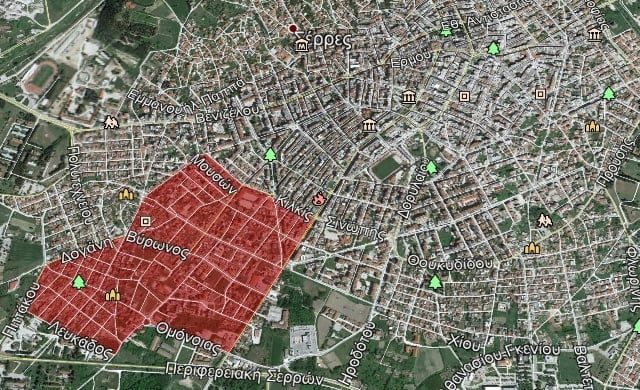 στην περιοχή που περικλείεται από τις οδούς Βύρωνος, Φλέμινγκ, Δογάνης, Πιττακού, Λευκάδος, Ομονοίας, Μεραρχίας, Κιλκίς και Τζαβέλλα.