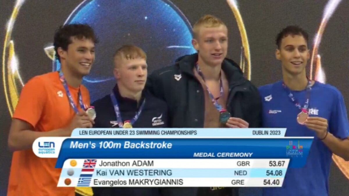 Ο Βαγγέλης Μακρυγιάννης που κατέκτησε το ασημένιο μετάλλιο στα 50μ ύπτιο, κατέκτησε σήμερα (13/8) το χάλκινο στα 100μ. ύπτιο, κατά τη διάρκεια της τελευταίας ημέρας του 1ου Ευρωπαϊκού Πρωταθλήματος Νέων Ανδρών-Νέων Γυναικών (Κ23) στο Δουβλίνο της Ιρλανδίας.