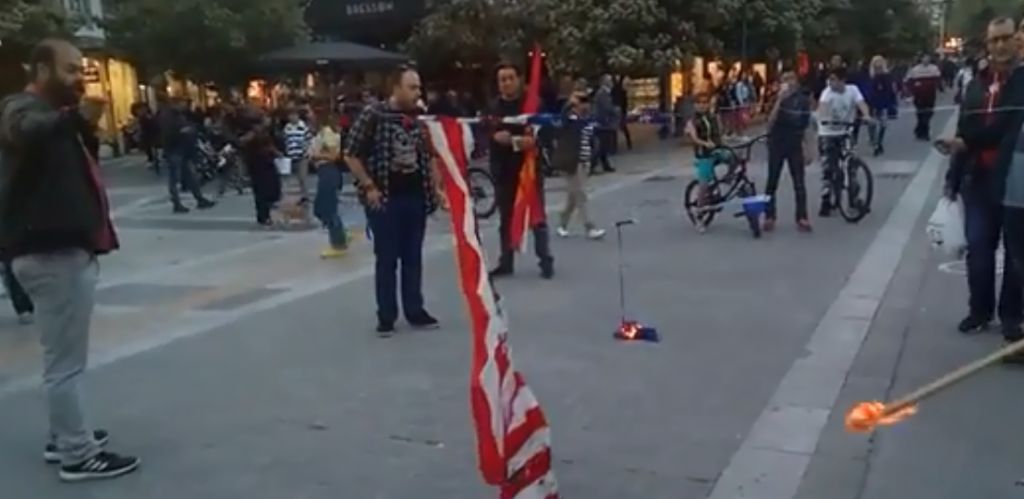 Όταν έφτασαν στην πλατεία Κρονίου προχώρησαν στο κάψιμο σημαιών της Ευρωπαϊκής Ένωσης και των Ηνωμένων Πολιτειών της Αμερικής.