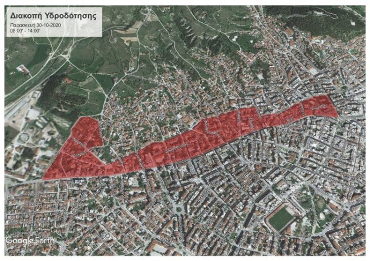 Λόγω αναγκαίας επισκευής βλάβης στο πρωτεύον δίκτυο ύδρευσης στην οδό Νικ. Πλαστήρα, αύριο Παρασκευή 30-10-2020 και στις ώρες 08:00 με 14:00’, θα σημειωθεί διακοπή υδροδότησης, στην περιοχή που περικλείεται από τις οδούς: