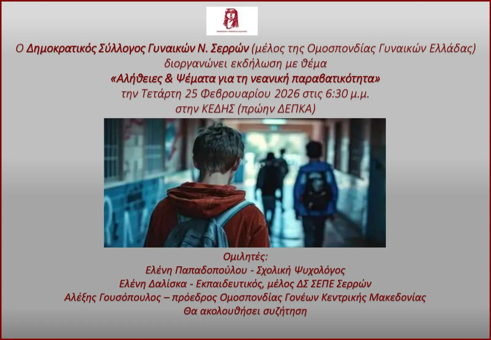 Ο Δημοκρατικός Σύλλογος Γυναικών Σερρών (μέλος της ΟΓΕ) σας προσκαλεί στην εκδήλωση – συζήτηση για τη νεανική παραβατικότητα  την Τετάρτη 25 Φλεβάρη στις 18:30 στο κτίριο της π. ΚΕΔΗΣ (Εθν. Αντίστασης 34).