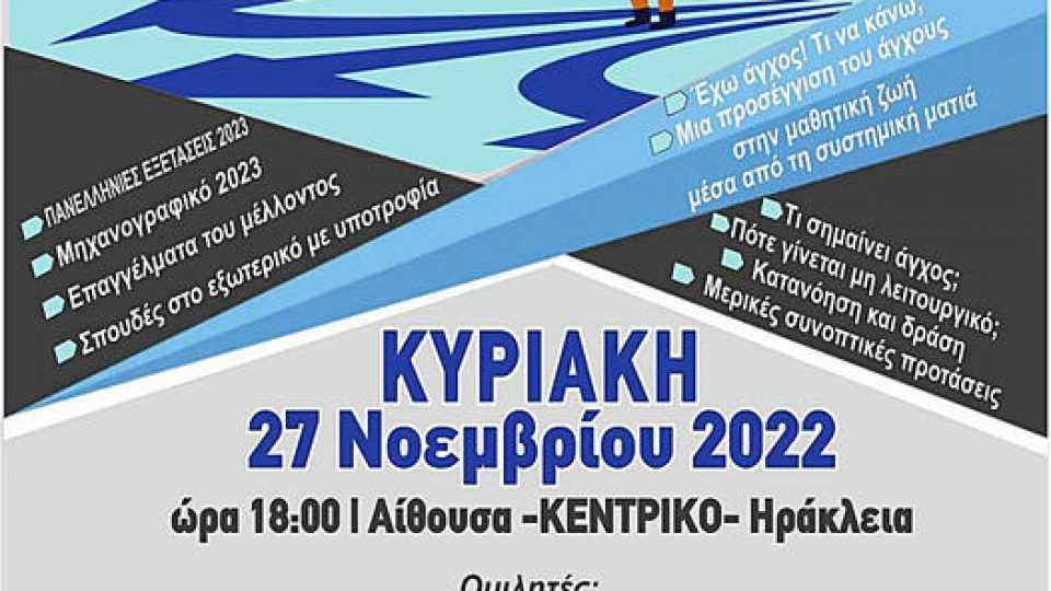 Ο  Σύλλογος  Γονέων και  Κηδεμόνων ΓΕΛ Ηράκλειας  και  ο  Δήμος  Ηράκλειας  συνδιοργανώνουν  εκδήλωση επαγγελματικού  προσανατολισμού,  τη Κυριακή 27 Νοεμβρίου  2022 και  ώρα 18:00, που  θα  πραγματοποιηθεί  στην  αίθουσα Κεντρικό  στην  Ηράκλεια με  θέμα: