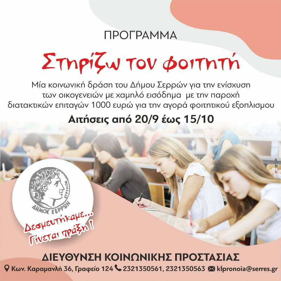 Ο Δήμος Σερρών για πρώτη φορά υλοποιεί το Πρόγραμμα «Στηρίζω τον φοιτητή» στο πλαίσιο των κοινωνικών δράσεων που αναπτύσσει για τη στήριξη των οικογενειών με χαμηλά εισοδήματα.