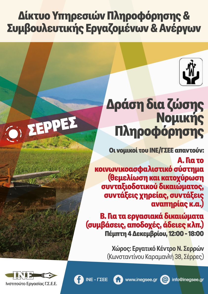 Το Ινστιτούτο Εργασίας της Γ.Σ.Ε.Ε. και το Εργατικό Κέντρο Σερρών διοργανώνουν δράση νομικής πληροφόρησης σε θέματα εργατικού δικαίου και δικαίου κοινωνικοασφαλιστικού συστήματος