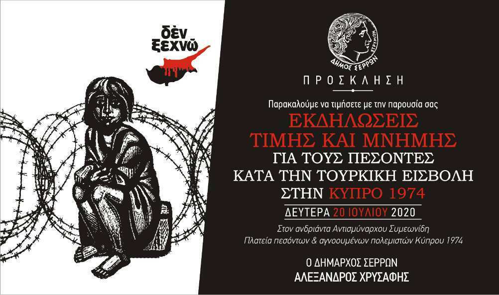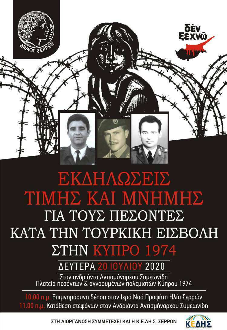 Σειρά εκδηλώσεων τιμής και μνήμης για τους πεσόντες κατά την Τουρκική εισβολή διοργανώνει ο Δήμος Σερρών, τη Δευτέρα 20 Ιουλίου.
