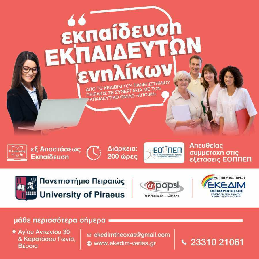 Το ΚΕΔΙΒΙΜ του Πανεπιστημίου Πειραιώς οργανώνει και υλοποιεί σε συνεργασία με τον Εκπαιδευτικό Όμιλο ΑΠΟΨΗ, σε όλη την επικράτεια και σε κύκλους, το επιμορφωτικό πρόγραμμα «ΕΚΠΑΙΔΕΥΣΗ ΕΚΠΑΙΔΕΥΤΩΝ ΕΝΗΛΙΚΩΝ» διάρκειας 200 ωρών.