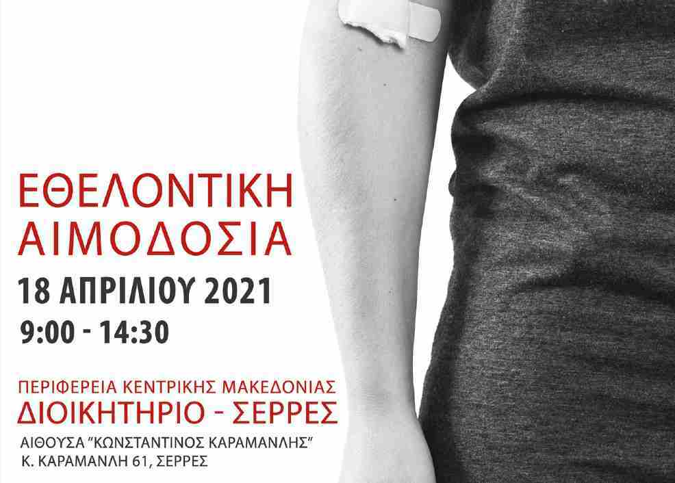 Η Περιφέρεια Κεντρικής Μακεδονίας, μέσω της Αντιπεριφέρειας Σερρών και της Αντιπεριφέρειας Υγείας, το Γενικό Νοσοκομείο Σερρών, το Εθνικό Κέντρο Αιμοδοσίας και το «Όλοι μαζί μπορούμε», έχοντας πλήρη συναίσθηση της ευθύνης τους για την ασφάλεια του αίματος και των αιμοδοτών, διοργανώνουν δράση Εθελοντικής Αιμοδοσίας για την επάρκεια των αποθεμάτων αίματος της χώρας, την Κυριακή 18 Απριλίου 2021, κατά τις ώρες 09.00-14.30, στην αίθουσα “Κωνσταντίνος Καραμανλής” στην Περιφερειακή Ενότητα Σερρών της Περιφέρειας Κεντρικής Μακεδονίας, στην οδό Κ. Καραμανλή 36 στις Σέρρες.