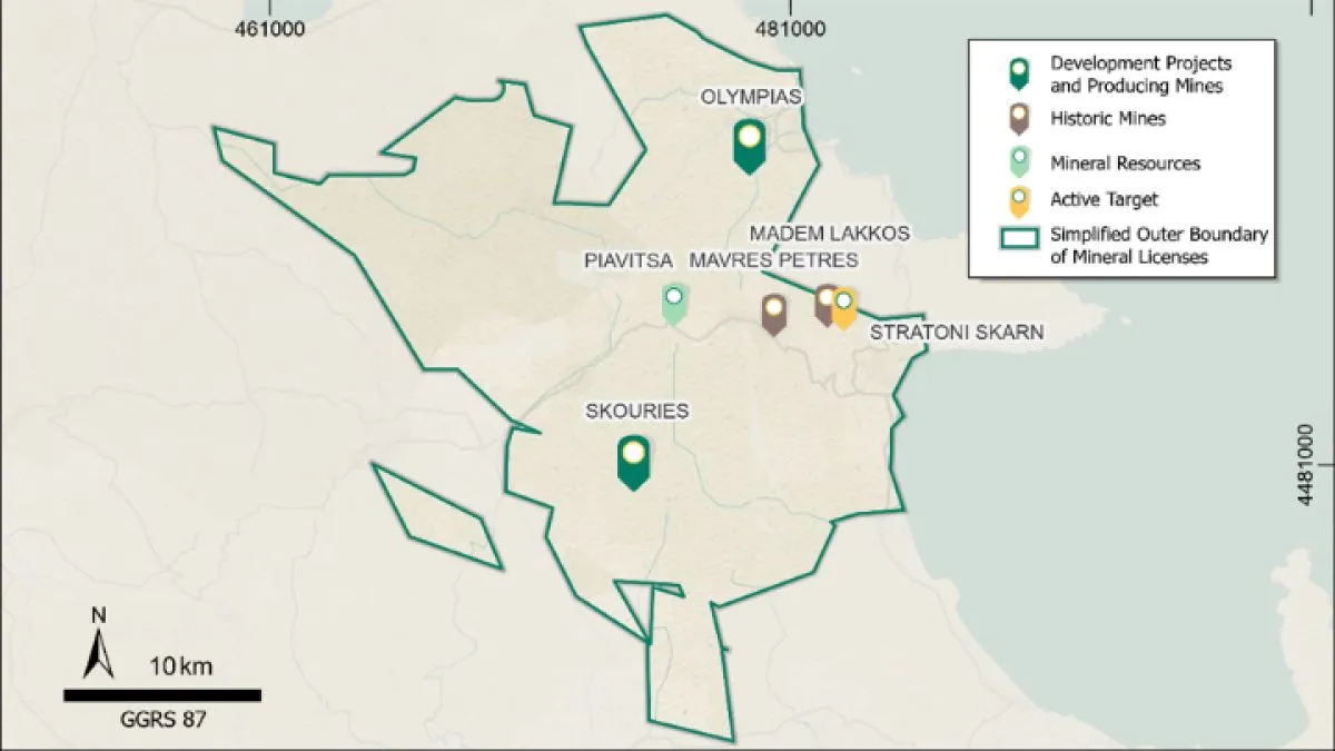 -Στην μεταλλευτική περιοχή της Χαλκιδικής, η γεωλογική έρευνα το 2025 επικεντρώθηκε στο μεταλλείο της Ολυμπιάδας, με ολοκλήρωση περίπου 17.500 μέτρων ερευνητικών γεωτρήσεων. Επιπλέον, εντοπίστηκε ένας νέος ερευνητικός στόχος χρυσού-χαλκού, το Σκαρν Στρατωνίου, που βρίσκεται κατά μήκος του ρήγματος Στρατωνίου, και φιλοξενεί επίσης τα ιστορικά μεταλλεία του Μαδέμ Λάκκου και των Μαύρων Πετρών, καθώς και το κοίτασμα της Πιάβιτσας.