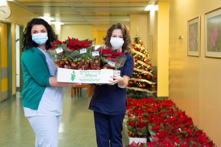 Από μια γλάστρα με αλεξανδρινό, το φωτεινό κατακόκκινο λουλούδι των Χριστουγέννων, παρέλαβαν υγειονομικοί του Νοσοκομείου, μαζί με τις ευχές και τον σεβασμό της επιχείρησης Θερμοκήπια «Αθηνά», στην Επανομή Θεσσαλονίκης, και του ιδιοκτήτη της, Γιάννη Πλαστήρα.