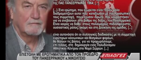 ΕΠΙΣΤΟΛΗ ΜΕ ΠΟΛΛΑ ΕΡΩΤΗΜΑΤΙΚΑ ΑΠΟ ΤΟ ΠΡΟΕΔΡΟ ΤΟΥ ΠΑΝΣΕΡΡΑΪΚΟΥ κ.ΝΙΚΟΛΤΣΙΟ(VIDEO)Για τα προβλήματα που υπάρχουν στην ομάδα του Πανσερραϊκού αναφέρεται με επιστολή του προς τους Σερραίους φιλάθλους ο πρόεδρος της ΠΑΕ Πανσερραϊκός Κωνσταντίνος Νικόλτσιος. Ο κος Νικόλτσιος με την επιστολή ζητά και από την Τοπική Αυτοδιοίκηση να βοηθήσει το στολίδι του Νομού όπως χαρακτηρίζει την σερραϊκή ομάδα.
