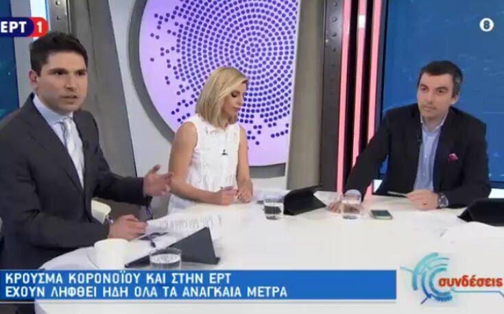«Τελευταία είδηση, τελευταία εξέλιξη, με μία ψυχραιμία… Ξέρετε λέμε όλες αυτές τις μέρες ότι μπήκε στη γειτονιά μας, θα έρθει και στη δική μας πόρτα… Ήρθε και στη δική μας πόρτα. Υπάρχει το πρώτο επιβεβαιωμένο κρούσμα κορονοϊού στη δημόσια τηλεόραση. Στο Ραδιομέγαρο της Αγίας Παρασκευής. Σας το ανακοινώνουμε εμείς για να μην το μάθετε από φήμες, πληροφορίες που μπορεί ενδεχομένως να διογκωθούν και να πάρουν άλλη έκταση».