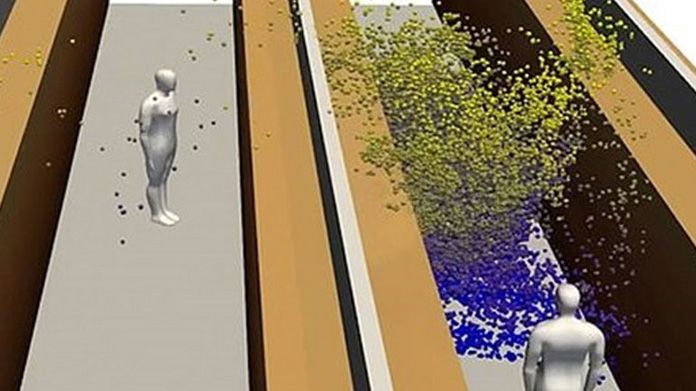 Στο βίντεο φαίνεται ότι τα σταγονίδια του βήχα μπορούν αμέσως να εξαπλωθούν σε δύο διαδρόμους του σούπερ μάρκετ.