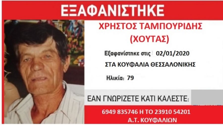 Ο 79χρονος, Χρήστος Ταμπουρίδης εξαφανίστηκε το απόγευμα της Πέμπτης από τα Κουφάλια Θεσσαλονίκης.