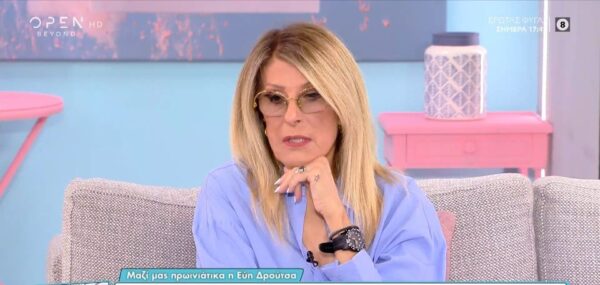 Την Εύη Δρούτσα φιλοξένησε η Μπέττυ Μαγγίρα, το πρωινό της Παρασκευής, στο πλατό της εκπομπής «Ποιος είναι πρωινιάτικα» του OPEN. Μεταξύ άλλων, δε, η γνωστή στιχουργός αναφέρθηκε στην μακρόχρονη καλλιτεχνική της διαδρομή, τις οικονομικές απολαβές αλλά και την αχαριστία.