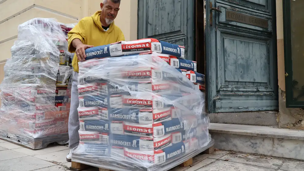 Η σημερινή ημέρα είναι σημαντική για τα μέλη του Συλλόγου, καθώς ο Ελληνικός Πολυεθνικός Όμιλος ISOMAT, μέσω του Προέδρου και Διευθύνοντος Συμβούλου κ. Θάνου Τζιρίτη, αποφάσισε να στηρίξει ενεργά την προσπάθεια, προσφέροντας τα απαραίτητα υλικά για την μόνωση και προστασία του κτηρίου. Πρόκειται για μια δωρεά ιδιαίτερα υψηλού κόστους.