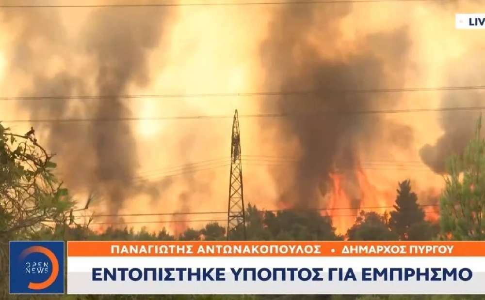 Υπόνοιες πως η μεγάλη φωτιά που καίει την Ηλεία ξεκίνησε έπειτα από εμπρησμό έχουν οι Αρχές. Σύμφωνα με τα όσα ανέφερε ο δήμαρχος Πύργου στον «αέρα» του Open, τα συστήματα ασφαλείας κατέγραψαν άνδρα να κινείται με μηχανάκι στην περιοχή Λαμπέτι και από όπου περνούσε μετά από λίγο η φωτιά φούντωνε.