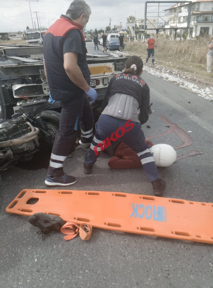 Σύμφωνα με πληροφορίες του enikos.gr, ο οδηγός της μοτοσικλέτας καρφώθηκε στο οπίσθιο μέρος της νταλίκας και βρέθηκε στο έδαφος έχοντας πολλαπλές κακώσεις, αλλά όχι κάποιο σοβαρό χτύπημα στο κεφάλι, με δεδομένο ότι φορούσε κράνος, ενώ καθοριστικό ρόλο έπαιξε το γεγονός ότι στο σημείο βρέθηκε από την πρώτη στιγμή κλιμάκιο της ΕΠΟΜΕΑ παράσχοντας τις πρώτες βοήθειες στον οδηγό.