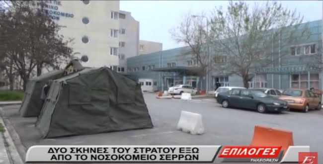 2 σκηνές του στρατού στήθηκαν το πρωί έξω από το χώρο των Επειγόντων περιστατικών στο νοσοκομείο Σερρών λόγω του κορωνοϊού.
