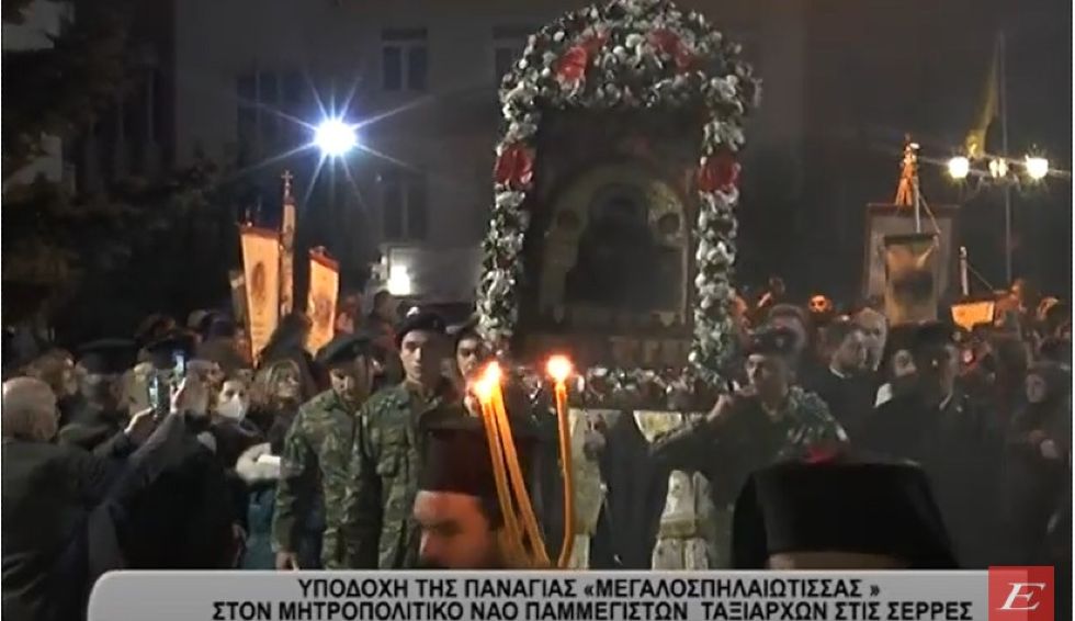 Με λαμπρότητα και κατάνυξη τελέστηκε η υποδοχή της ιεράς εικόνας της Παναγίας «Μεγαλοσπηλαιώτισσας » από την Ιερά Μονή Μεγάλου Σπηλαίου Καλαβρύτων, στον Ιερό Μητροπολιτικό Ναό Παμμεγίστων Ταξιαρχών, με την ευλογία της Ιεράς Συνόδου της Εκκλησίας της Ελλάδος, το απόγευμα της Κυριακής στις Σέρρες στο πλαίσιο των λατρευτικών ακολουθιών που τελούνται με αφορμή τον πανηγυρικό εορτασμό της συνάξεως των Παμμεγίστων Ταξιαρχών πολιούχων της πόλης .
