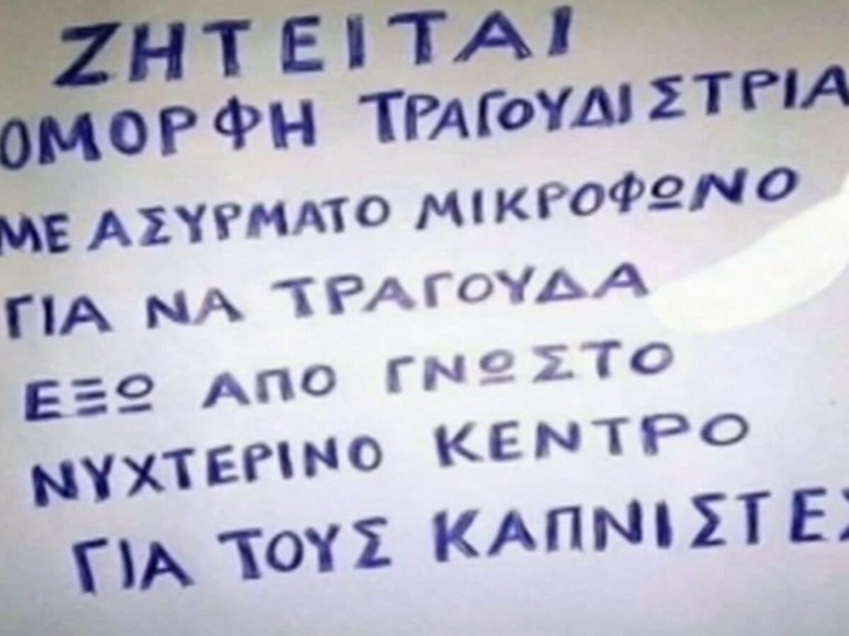 Viral έχει γίνει μια χιουμοριστική αγγελία η οποία αναφέρει ότι ένα νυχτερινό κέντρο ζητάει τραγουδίστρια για να τραγουδάει έξω από το μαγαζί για τους καπνιστές!