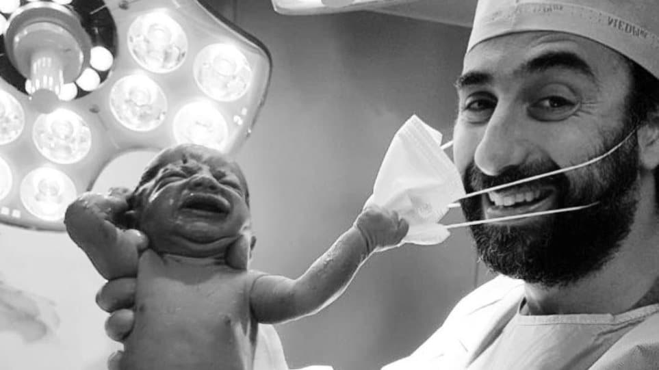 Ο λόγος φυσικά δεν είναι γιατί είναι ένα νεογέννητο μωρό, αλλά επειδή το νεογνό τραβά τη μάσκα του γιατρού την ώρα που το κρατάει στα χέρια του.