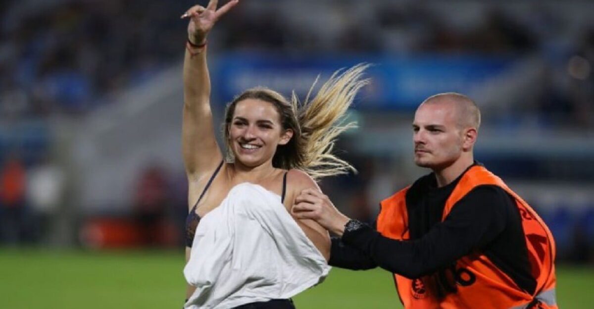 Σε ένα σκηνικό που έχουμε ξαναδεί στα γήπεδα, η γυναίκα οπαδός θέλησε προφανώς να… περάσει κάποιο δικό της μήνυμα εισβάλλοντας ημίγυμνη και προκαλώντας προσωρινή διακοπή του παιχνιδιού.