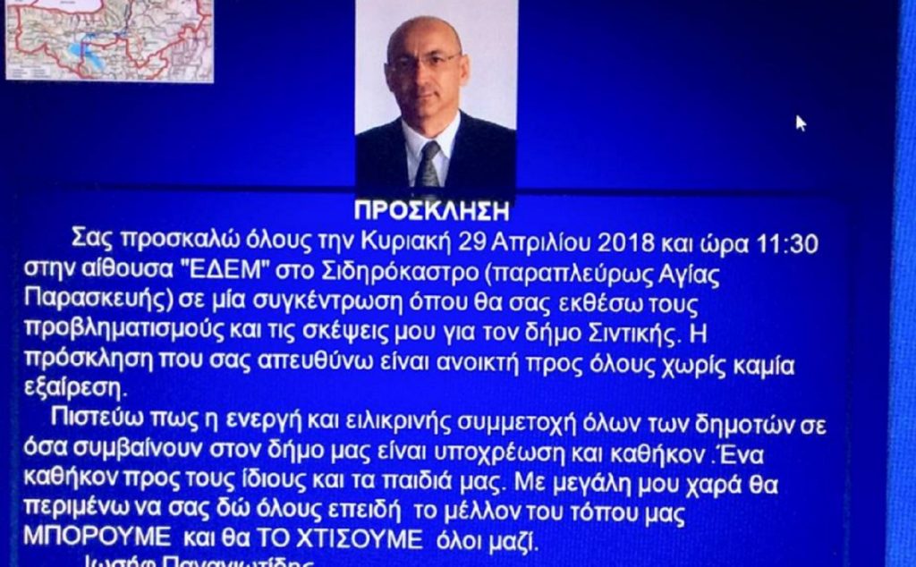 Σας προσκαλώ όλους την Κυριακή 29 Απριλίου 2018 και ώρα 11:30 στην αίθουσα “ΕΔΕΜ” στο Σιδηρόκαστρο (παραπλεύρως Αγίας Παρασκευής) σε μία συγκέντρωση όπου θα σας εκθέσω τους προβληματισμούς και τις σκέψεις μου για τον δήμο Σιντικής. Η πρόσκληση που σας απευθύνω είναι ανοικτή προς όλους χωρίς καμία εξαίρεση.