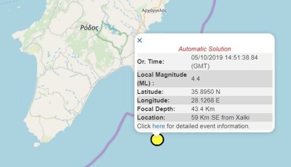 σχυρός σεισμός μεγέθους 4,5 Ρίχτερ βαθμών της κλίμακας Ρίχτερ σημειώθηκε στις 17.53 το απόγευμα του Σαββάτου στον θαλάσσιο χώρο νότια της Ρόδου.