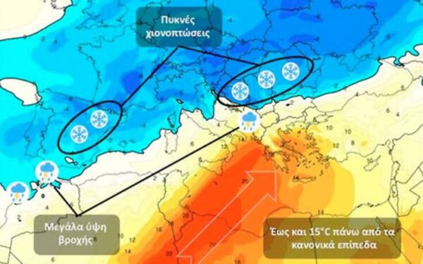 Η μεταφορά ψυχρών αερίων μαζών σε ασυνήθιστα μικρά γεωγραφικά πλάτη πάνω από τη Δυτική Ευρώπη και τη Βορειοδυτική Αφρική θα προκαλέσει τη μεταφορά πολύ θερμών αερίων μαζών προς την περιοχή μας.